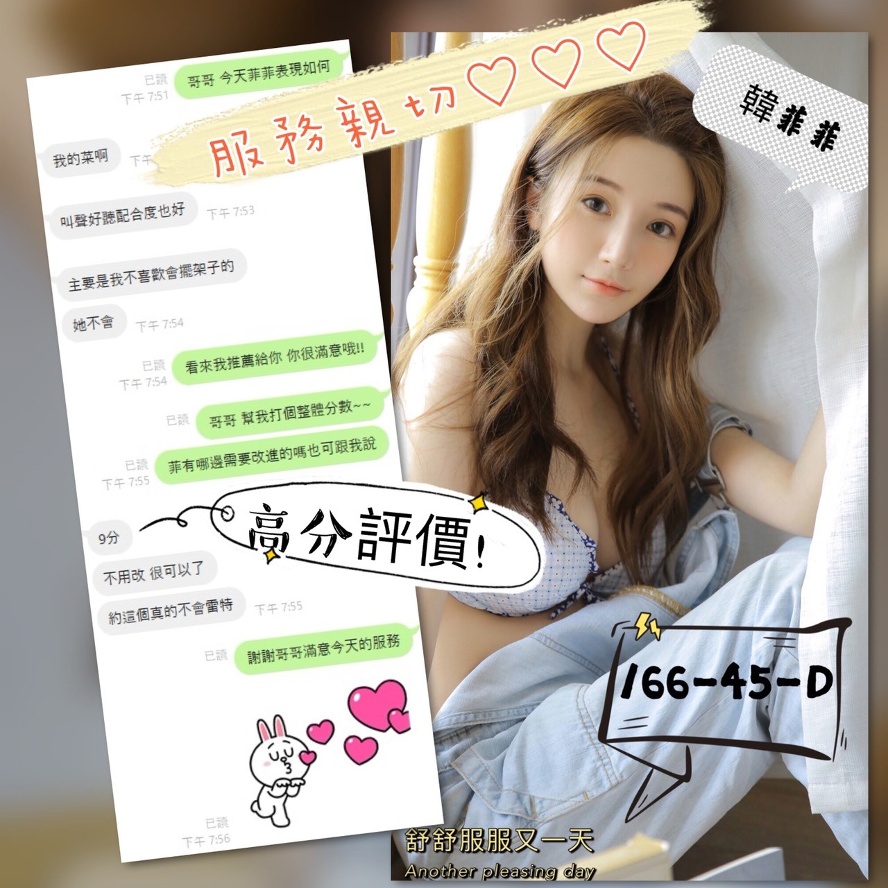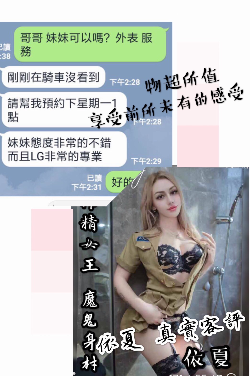 可配合 :按摩,69,陪洗,共浴,殘廢澡,LG(舌吻)依氣氛衛生而定,可親嘴,無套吹,品鮑,舔蛋,輕功,過水,漫遊,奶推,屁推,變裝(自備免付),絲襪(自備免付),中文溝通,快餐,2S